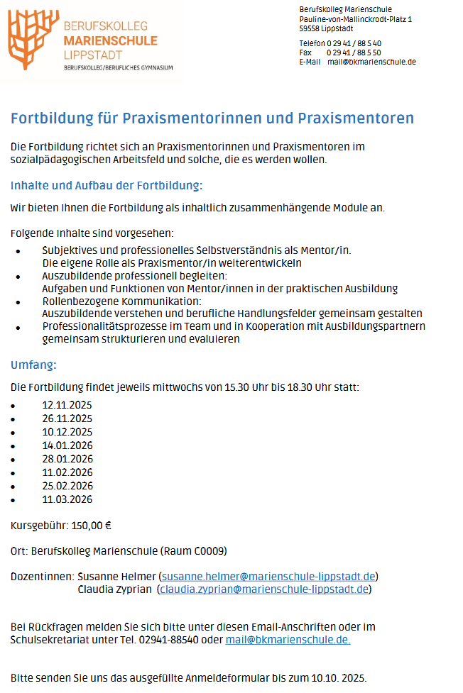 Fortbildung für Praxismentor:innen Link: Anmeldebogen Fortbildung Praxismentorinnen und Praxismentoren Zurück zur Übersicht